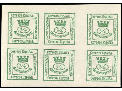 ESPAÑA. 1869. GOBIERNO PROVISIONAL. Proyecto no adoptado. PRUEBA DE PUNZÓN en negro más 5 ENSAYOS DE COLOR más ensayo con letras "P. del P.E.". (Gálvez 486, 492/93, 496, 500/01 y 502).
