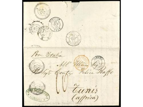 ESPAÑA. 1867. ALMERÍA a TÚNEZ. Sobre sin franquear, con tránsitos en Madrid, San Juan de Luz, Burdeos, Marsella, Argelia y llegada después de 25 días. Curiosa.
