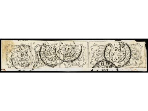 Δ ITALIA ANTIGUOS ESTADOS: ESTADOS PONTIFICIOS. Ed. 9a (5). 1856. 8 baj. blanco "oleoso". Tira de cinco sobre pequeño fragmento, mat. fechador de Roma.