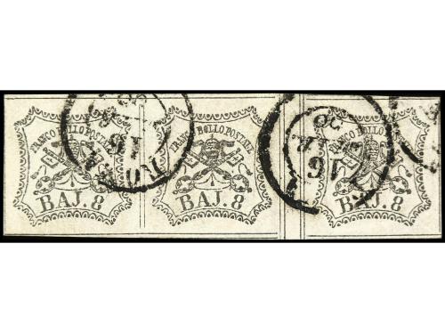 Δ ITALIA ANTIGUOS ESTADOS: ESTADOS PONTIFICIOS. Sa. 9a. 1856. 8 baj. blanco "oleoso". Tira de tres con interespacio de grupo.