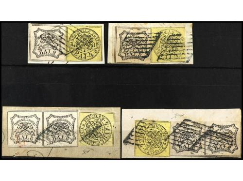 Δ ITALIA ANTIGUOS ESTADOS: ESTADOS PONTIFICIOS. Sa. 5A, 9. 1852. Conjunto de cuatro fragmentos con combinaciones del 4 baj. amarillo y el 8 baj. blanco.