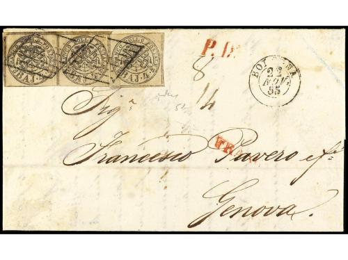 ITALIA ANTIGUOS ESTADOS: ESTADOS PONTIFICIOS. Sa. 5b (3). 1855. BOLOGNA a GÉNOVA. 4 baj. sepia "oleoso" tres sellos.