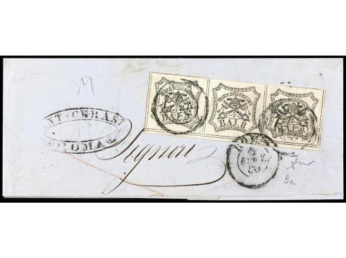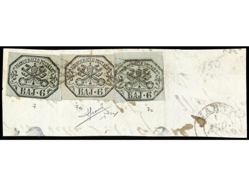 Δ ITALIA ANTIGUOS ESTADOS: ESTADOS PONTIFICIOS. Sa. 9a (3). 1855. Fragmento con una tira de tres del 8 baj. blanco "oleoso" con mat. fechador de Roma.