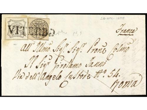 ITALIA ANTIGUOS ESTADOS: ESTADOS PONTIFICIOS. Sa. 5b, 9. 1855. VITERBO a ROMA. 4 baj. sepia "oleoso" y 8 baj. blanco mat. lineal VITERBO.