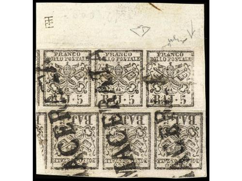 Δ ITALIA ANTIGUOS ESTADOS: ESTADOS PONTIFICIOS. Sa. 8b. 1855. 7 baj. azul "oleoso". Bloque de seis, mat. parrilla. Precioso. Firmas GIULIO BOLAFFI, ALBERTO DIENA y RAYBAUDI.