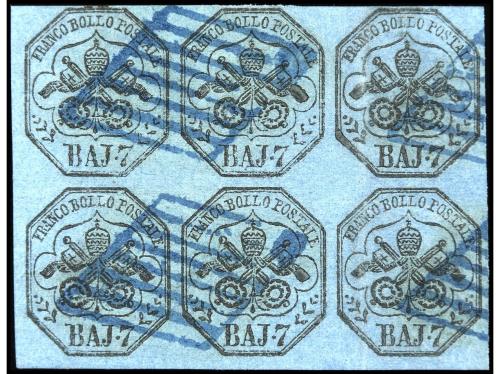 ° ITALIA ANTIGUOS ESTADOS: ESTADOS PONTIFICIOS. Sa. 8b. 1855. 7 baj. azul "oleoso". Bloque de seis, mat. parrilla azul (raro), leve punto claro en un sello. MAGNÍFICO.