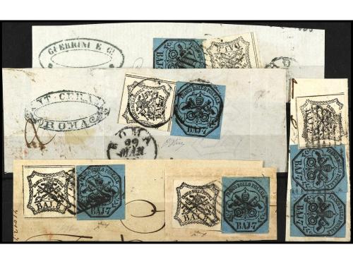 Δ ITALIA ANTIGUOS ESTADOS: ESTADOS PONTIFICIOS. Sa. 8, 9. 1852. Conjunto de 5 fragmentos con sello 7 baj + 8 baj.