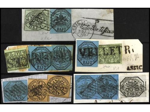 Δ ITALIA ANTIGUOS ESTADOS: ESTADOS PONTIFICIOS. Sa. 7 y 7A. 1852. Conjunto de 5 fragmentos con sellos de 6 baj. gris verde y gris lila combinados con diversos valores de la emisión.