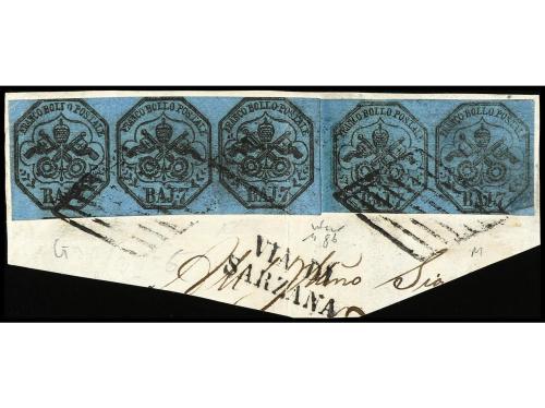 Δ ITALIA ANTIGUOS ESTADOS: ESTADOS PONTIFICIOS. Sa. 8b. 1855. 7 baj, azul "oleoso". Fragmento con una pareja y una tira de tres. PRECIOSA.