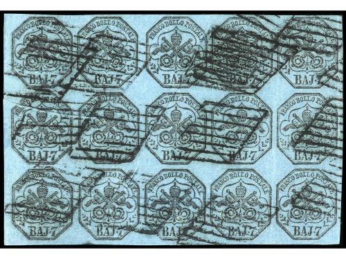 Δ ITALIA ANTIGUOS ESTADOS: ESTADOS PONTIFICIOS. Sa. 8b. 1855. 7 baj. azul "oleoso". Bloque de 15 sellos, mat. parrilla, algunos fuelles del papel sin importancia. Firmado GIULIO BOLAFFI, ALBERTO BOLAFFI, ALBERTO DIENA y ENZO DIENA. PRECIOSO y RARO.