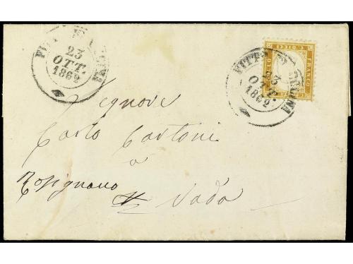ITALIA. Sa. 1. 1862. 10 cts. bistre. Muy bonito en carta.