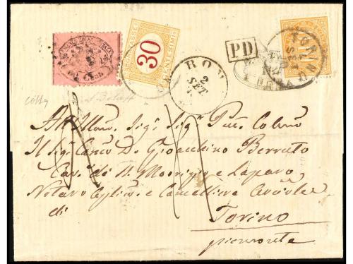 ITALIA ANTIGUOS ESTADOS: ESTADOS PONTIFICIOS. Sa. 30. 1870. ROMA a TORINO. 80 cents. rosa tasada a la llegada con sellos de 10 cts. y 30 cts. Muy rara combinación de franqueo. Cert. COLLA.
