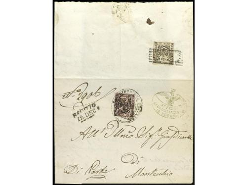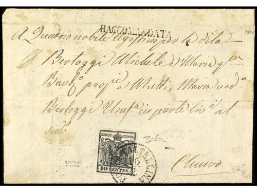 ITALIA ANTIGUOS ESTADOS: LOMBARDO-VENECIA. Sa. 2. 1856 (16-2). PONTE VALTELLINA a CLIVIO. "Atto di Pignorazione" circulado con sello de 10 cents. negro por correo certificado marca RACCOMANDATA. Al dorso falta el sello de 30 cents. para el correo certificado. MUY INTERESANTE y RARA TARIFA, a pesar de estar incompleta. Cert. G. COLLA.