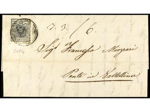 ITALIA ANTIGUOS ESTADOS: LOMBARDO-VENECIA. Sa. 2. 1851 (19 septiempre). MILANO a PONTE IN VALTELLINA. 10 cts. negro, mat. fechador de cuatro círculos de Milano (C4), tasada con 3.3./6 (soldi) por falta de franqueo, al dorso fechador de llegada. RARA y de EXCELENTE CALIDAD. Firmada COLLA.