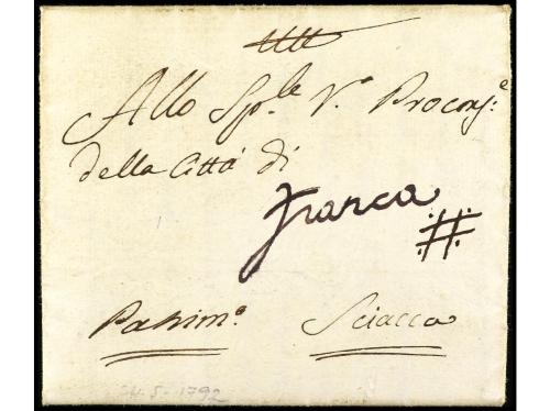 ITALIA ANTIGUOS ESTADOS: DOS SICILIAS - NAPOLES. 1792 (27 Mayo). PALERMO a SCIACCA. Carta completa con texto. Marca lineal FRANCA. RARA.