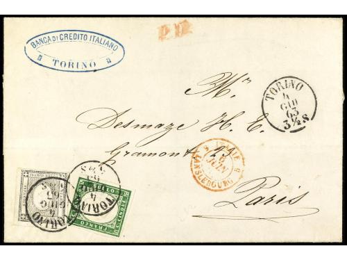 ITALIA. 1863. TORINO a PARÍS. 5 cts. verde y 1 cto. gris. Rara tarifa de impresos a Francia.