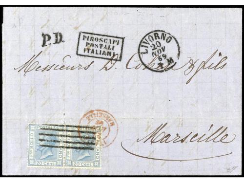 ITALIA. 1869. LIVORNO a MARSELLA. 20 cts. azul (2) mat. cinco barras de Livorno. PRECIOSA.