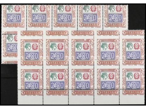 ** ITALIA. Sa. 2739. 2004. 2,80 liras multicolor, dos bloques de 10, dentado desplazado hacia abajo y hacia arriba (ITALIA en la parte superior).