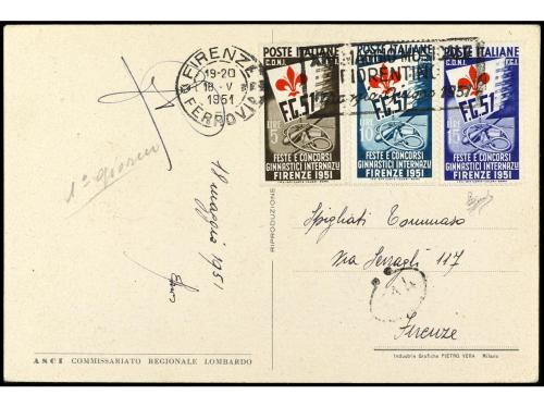 ITALIA. Yv. 559/601, Sa. 661/3. 1951 (18/5). SERIE COMPLETA, 3 valores en tarjeta postal con mat. primer dia. Cert. G. BIONDI. Cat. Sa. 2.750€.