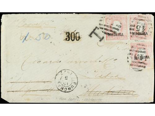 PORTUGAL: MADEIRA. Mu. 17. 1877. Sobre procedente de Brasil sin franqueo y circulada por el correo inglés vía Liverpool a Madeira vía Lisboa y allí redirigida otra vez a Lisboa con franqueo de tres sellos de 25 reis habilitados MADEIRA. La carta fue tasada con 300 reis que una vez fueron pagados se anularon para no ser cobrados otra vez al ser redirigida a Lisboa, algunos defectos. Muy interesante combinación.