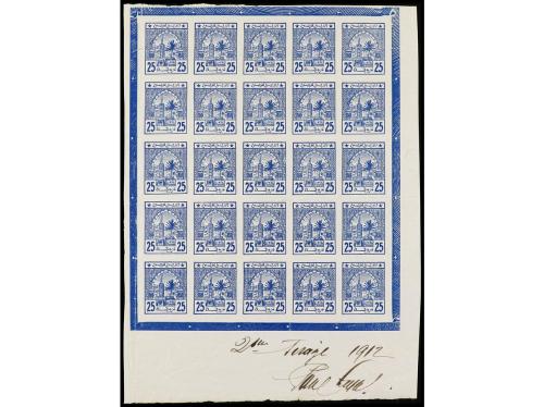 (*) MARRUECOS FRANCES. Yv. 5. 1912. POSTES CHERIFIENNES. 25 m. azul. Mini hojita de 25 sellos SIN DENTAR, pliegue central y laterales manuscrito "2me Tiraje 1912" y firma. RARO. Cat. 2.500€.