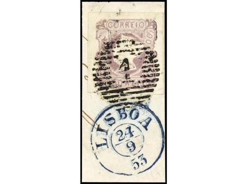 Δ PORTUGAL. Mu. 4. 1853. 100 reis lila sobre pequeño fragmento, mat. círculo de barras con 1 en el interior y fechador de LISBOA/24/9/53 en azul. PRECIOSO.