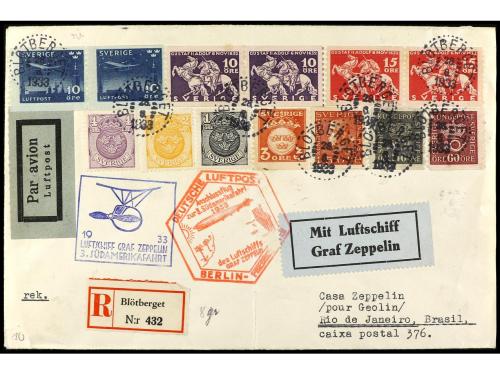 SUECIA. 1933. BLOTBERGET a BRASIL. Circulada por Graf Zeppelin. Precioso franqueo y marcas del vuelo, al dorso tránsitos y llegada.