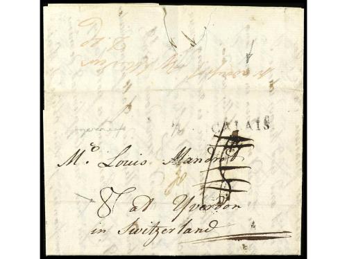 SUIZA. 1789. NIÁGARA (Canadá) a YVERDON (Suiza). Carta completa con texto encaminada hasta Francia (al dorso encaminados manuscrito) y depositada al correo en Calais, tasa "18" anulada y certificada a "87". Muy rara destinación a Suiza en el siglo XVIII y probablemente la más antigua procedente de Canadá.