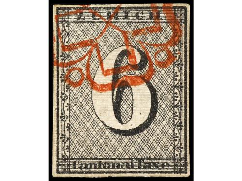 ° SUIZA. Yv. 10, Zu. 2W. 1843. 6 Rp. negro, mat. roseta, líneas de fondo horizontal. Buenos márgenes y gran calidad. PIEZA DE LUJO. Cert. MOSER y RELLSTAB. Cat. 1.700€.