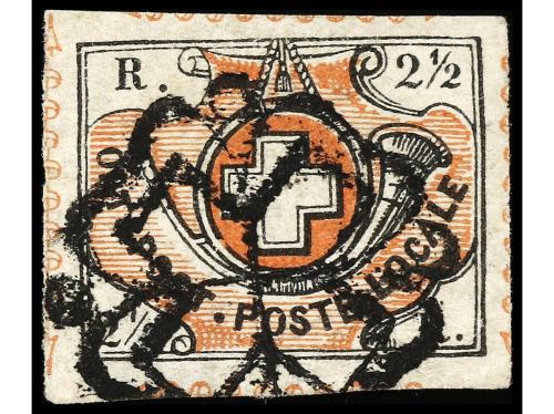 ° SUIZA. Yv. 13, Zu. 13II. 1850. 2 1/2 Rp. ORTS-POST, cruz no encuadrada. Pliegue horizontal (horizontal fold). Mat. P.P. en negro. Firmado CALVES. Cat. 3.000€.