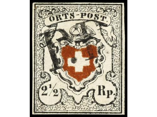 (*) SUIZA. Yv. 7, Zu. 8. 1845. 2 1/2 Rp. azul y rojo. Márgenes completos y leve adelgazamiento al dorso (slightly thinned at the back). PRECIOSO y RARO. Cert. ESTOPPEY (1968). Cat. 16.000€.