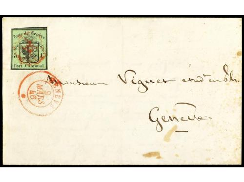 ° SUIZA. Yv. 1A, Zu. 4R. 1843. GENÈVE. Medio doble de Ginebra. 5 c. verde. Perfecto estado. PIEZA DE LUJO. Cert. VON DER WEID. Cat. 10.000€.