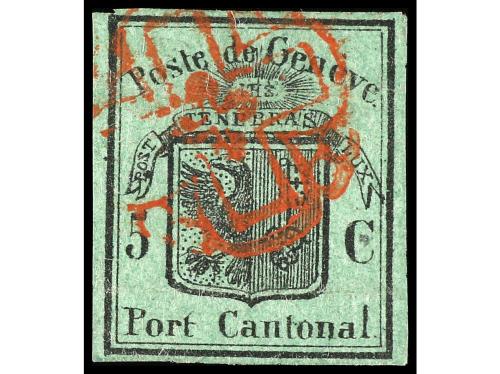 SUIZA. Yv. 2, Zu. 5. 1846. 5 c. "águila pequeña", en sobrescristo GENÈVE interior. Márgenes completos y mat. roseta. Cert. VON DER WEID.