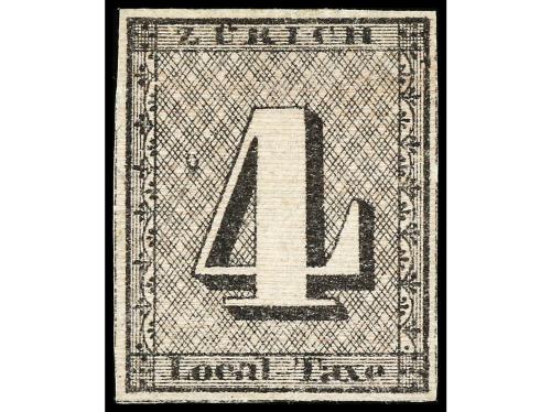 (*) SUIZA. Yv. 9, Zu. 1W. 1843. 4 Rp. negro, líneas de fondo horizontales. Márgenes completos y buena calidad. Sello sin goma, como se emitieron. PIEZA DE LUJO. Cert. NUSSBAUM (1972). Cat. 20.000€.