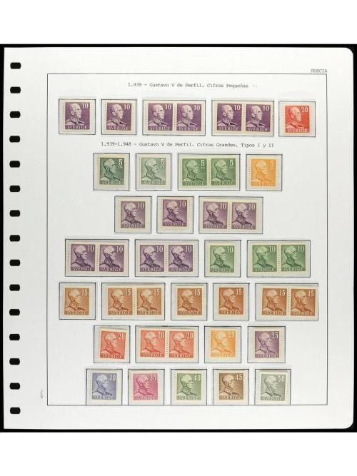 LOTES y COLECCIONES. 1939/1968. SUECIA. SERIE BÁSICA. 2 hojas de álbum conteniendo las series Yvert. 257/8, 259/72, 333/40A, 394 y 474/80 con distintas combinaciones de dentado. Destacan: Yv. 257c (2), 260d (2), 339a y 480a. RARO CONJUNTO. Cat. Yv. 1.264Ђ. Foto en web.