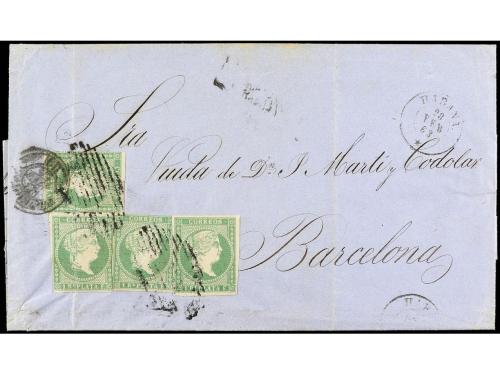 CUBA. Ant. 8 (4). 1863. HABANA a BARCELONA. 1 real verde (4). Mat. Parrilla de La Habana. MUY RARO franqueo.
