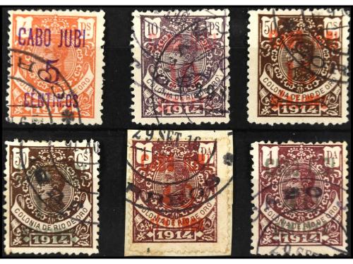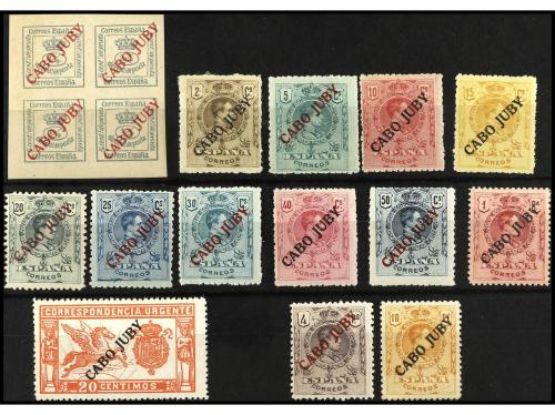 COLONIAS ESPAÑOLAS: CABO JUBY. Ed. 1/4A sin 4. SERIE COMPLETA a falta del 40 cts. (habilitación en carmín). Ed. 3 y 4A sobre fragmento. Cat. 250€.