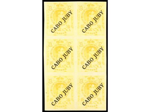 ** COLONIAS ESPAÑOLAS: CABO JUBY. Ed. 9s. 15 c. amarillo, bloque de 6 SIN DENTAR. Pliegue central sin afectar a los sellos. Cat. 342€.