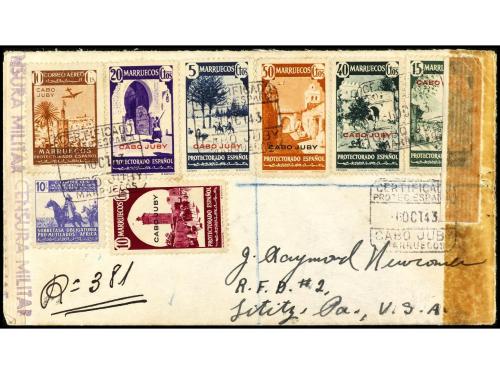 COLONIAS ESPAÑOLAS: CABO JUBY. Ed. 118/21, 124, 126, 134. 1943. CABO JUBY a U.S.A. Precioso franqueo. Censura Militar de Las Palmas y llegada al dorso.