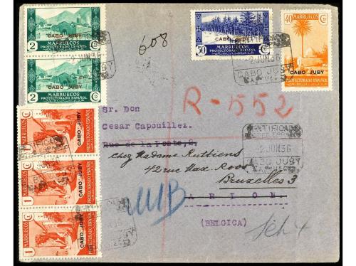 COLONIAS ESPAÑOLAS: CABO JUBY. Ed. 67 (3), 68 (2), 81, 82. 1936. CABO JUBY a BÉLGICA. 1 cto. (3), 2 cts. (2), 40 cts. y 50 cts. al dorso llegada. MUY BONITA.