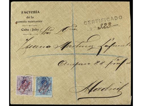 COLONIAS ESPAÑOLAS: CABO JUBY. Ed. 4F, 4H. 1917. CABO JUBY a MADRID. 15 cts. violeta y 25 cts. azul de Marruecos usado en Cabo Juby, carta certificada, al dorso llegada.