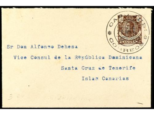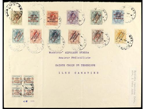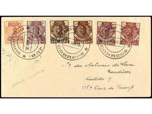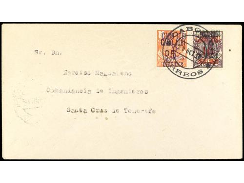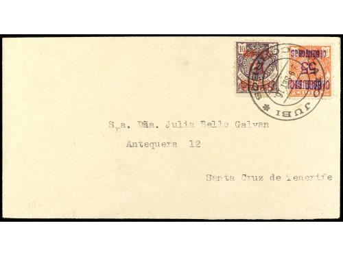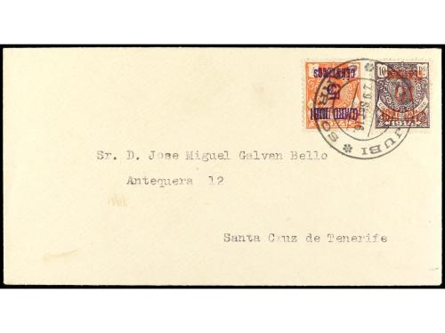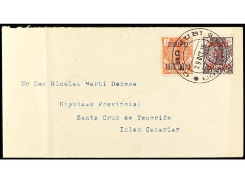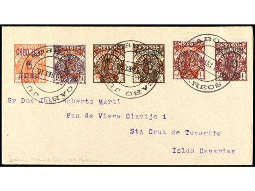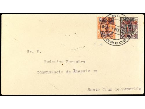 COLONIAS ESPAÑOLAS: CABO JUBY. Ed. 1hhi, 2hi. 1916. CABO JUBY a SANTA CRUZ DE TENERIFE. 5 cts. s. 4 pts. habilitación invertida doble y 10 cts. s. 10 pts. habilitación invertida, al dorso llegada. RARÍSIMA. Dictamen GRAUS.