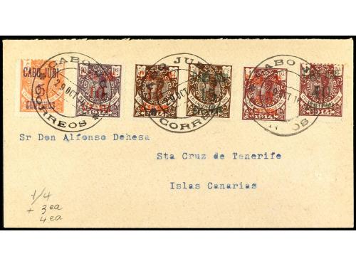 COLONIAS ESPAÑOLAS: CABO JUBY. 1/4 + 3A/4A, 1/4 + 3A/4Ahi, 2hcc, 2hcca, 3hcc, 1hh, 2hh, 2hha, 1FNhz más la serie con las cifras gruesas normal y el 5 cts. y 15 cts. invertida. En carta filatélica de CABO JUBI a Las Palmas. Excepcional franqueo probablemente ÚNICA CONOCIDA, procedente de la colección J.M. ALFARO.