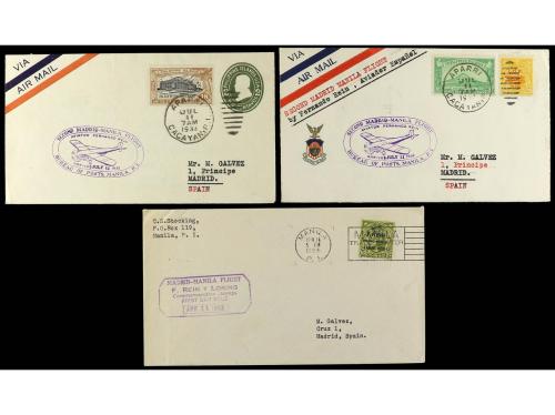 FILIPINAS. 1932 (11 julio). SEGUNDO VUELO MADRID a MANILA realizado por el aviador F. Rein. Tres sobres de la etapa APARRI-MANILA con diversas marcas del vuelo (Mu. 84) .
