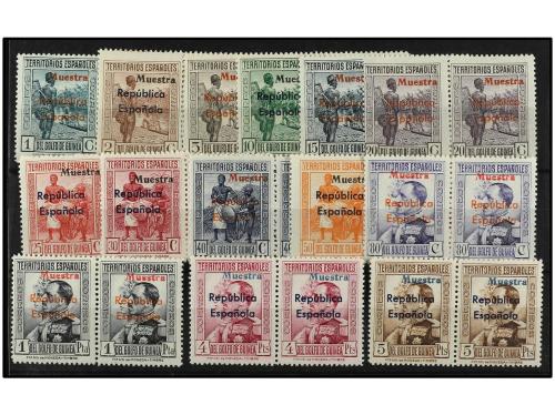 * COLONIAS ESPAÑOLAS: GUINEA. Ed. 230/43M. SERIE COMPLETA en parejas habilitados MUESTRA, un sello variedad "Españolo" (uno por hoja). RARÍSIMA VARIEDAD COMBINADA, probablemente ÚNICA CONOCIDA.