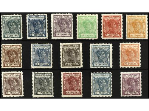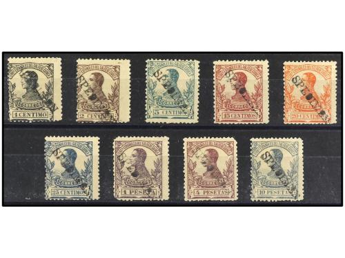 Δ COLONIAS ESPAÑOLAS: GUINEA. 1905. ENSAYO DE LA HABILITACION "GUINEA CONTINENTAL ASSOBLA" en color azul sobre los valores 1, 2, 3, 4, 5, 10, 15, 25, 50 y 75 cts. de Elobey. RARÍSIMO y según Francisco Aracil único conocido (ver tomo II pág. 40, 41).