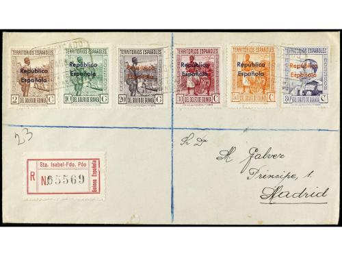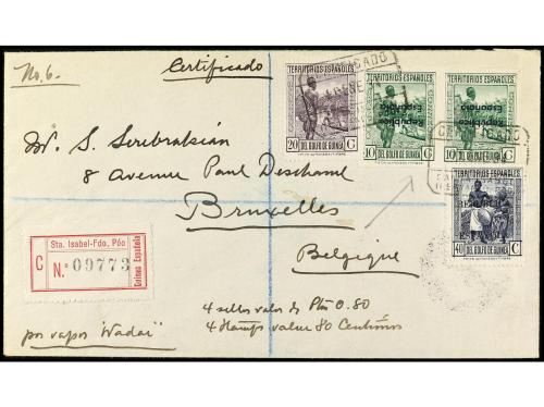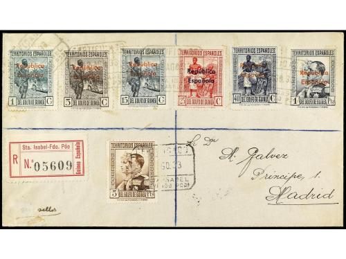 COLONIAS ESPAÑOLAS: GUINEA. Ed. 215, 230, 232, 234, 236, 241. 1933. STA. ISABEL a MADRID. Carta certificada, precioso y raro franqueo con el 5 pts. Al dorso llegada.