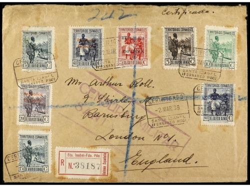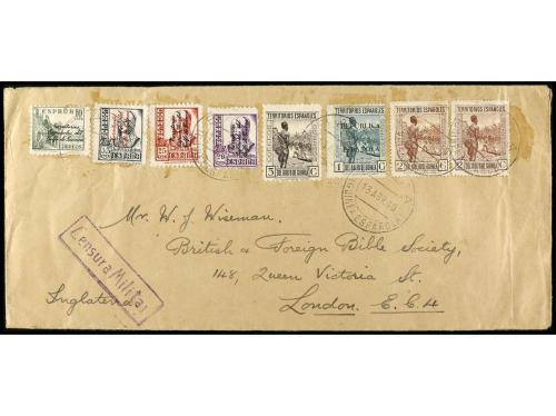 COLONIAS ESPAÑOLAS: GUINEA. Ed. 222, 224, 235, 238, 246/48. 1939. STA. ISABEL a INGLATERRA. Carta certificada, precioso franqueo, al dorso Censura Militar Sta. Isabel.