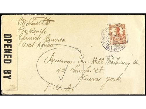 COLONIAS ESPAÑOLAS: GUINEA. 1918. RIO BENITO a NEW YORK. 30 cts. carmín, etiqueta de Censura Militar en USA, al dorso llegada.