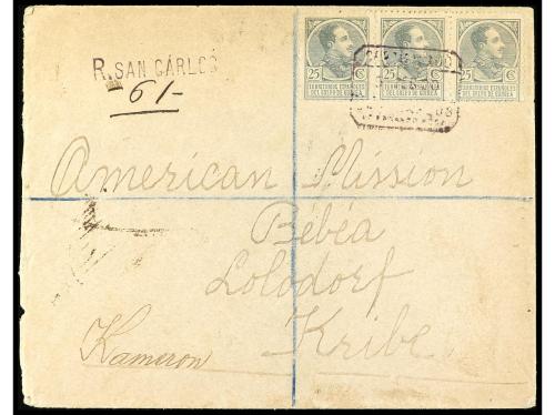 COLONIAS ESPAÑOLAS: GUINEA. Ed. 134 (3). 1930. S. CARLOS a KRIBE (Camerún). 25 cts. verde (3) carta certificada. Al dorso tránsito por Sta. Isbel.